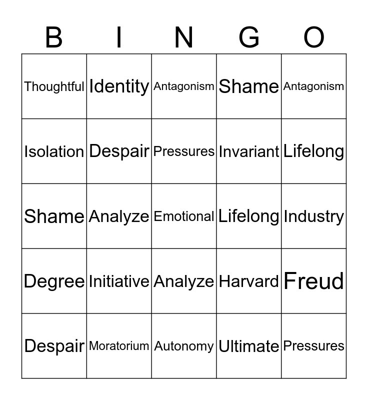 This bingo card has 50 words: Moratorium, Emotional, Trust, Autonomy, Initiative, Industry, Identity, Unclear, Isolation, Generation, Despair, Shame, Freud, Harvard, Degree, Faith, Pressures, Lifelong, Widen, Antagonism, Analyze, Ultimate, Thoughtful, Invariant, Biological, Pressures, Lifelong, Widen, Antagonism, Analyze, Ultimate, Thoughtful, Invariant, Biological, Moratorium, Emotional, Trust, Autonomy, Initiative, Industry, Identity, Unclear, Isolation, Generation, Despair, Shame, Freud, Harvard, Degree and Faith.