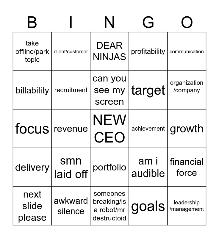 This bingo card has a free space and 24 words: smn laid off, awkward silence, can you see my screen, next slide please, communication, take offline/park topic, billability, client/customer, achievement, portfolio, target, focus, am i audible, financial force, recruitment, goals, growth, DEAR NINJAS, organization /company, revenue, leadership /management, delivery, profitability and someones breaking/is a robot/mr destructoid.