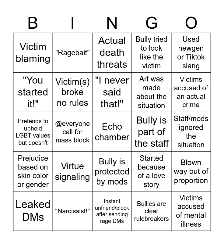 This bingo card has a free space and 24 words: Virtue signaling, "Narcissist!", "I never said that!", Leaked DMs, Used newgen or Tiktok slang, Victim blaming, "You started it!", "Ragebait", Bully is part of the staff, Bully is protected by mods, Art was made about the situation, Pretends to uphold LGBT values but doesn't, Started because of a love story, Blown way out of proportion, Victim(s) broke no rules, Bullies are clear rulebreakers, Staff/mods ignored the situation, Actual death threats, Victims accused of an actual crime, @everyone call for mass block, Victims accused of mental illness, Prejudice based on skin color or gender, Bully tried to look like the victim and Instant unfriend/block after sending rage DMs.