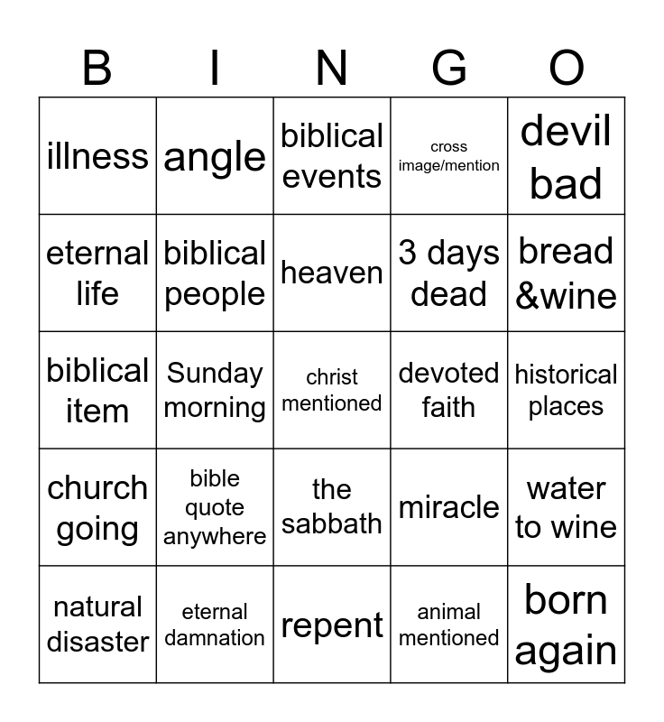 This bingo card has a free space and 24 words: natural disaster, bible quote anywhere, heaven, animal mentioned, devil bad, illness, angle, biblical events, devoted faith, historical places, biblical item, biblical people, miracle, water to wine, eternal life, eternal damnation, repent, cross image/mention, bread &wine, church going, Sunday morning, the sabbath, 3 days dead and born again.