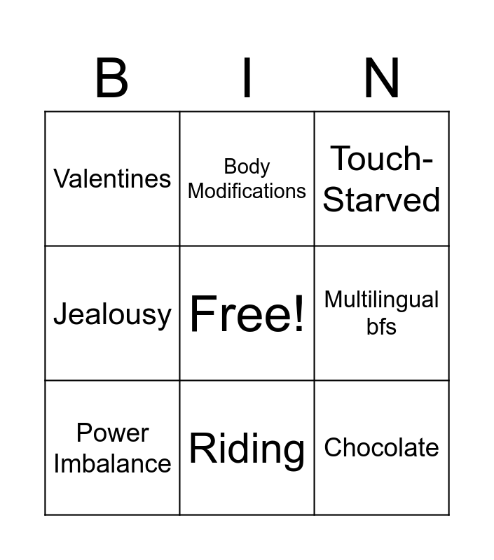 This bingo card has a free space and 8 words: Multilingual bfs, Touch-Starved, Body Modifications, Power Imbalance, Valentines, Chocolate, Jealousy and Riding.