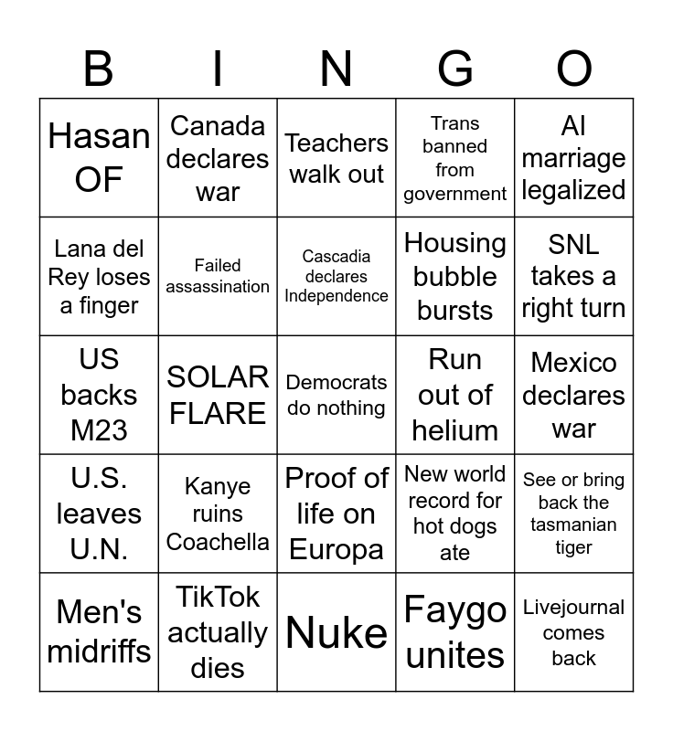 This bingo card has a free space and 24 words: Kanye ruins Coachella, TikTok actually dies, Cascadia declares Independence, Men's midriffs, AI marriage legalized, Hasan OF, Lana del Rey loses a finger, Canada declares war, Run out of helium, Proof of life on Europa, Housing bubble bursts, US backs M23, New world record for hot dogs ate, See or bring back the tasmanian tiger, Failed assassination, Faygo unites, Mexico declares war, Teachers walk out, SNL takes a right turn, SOLAR FLARE, Livejournal comes back, U.S. leaves U.N., Trans banned from government and Nuke.