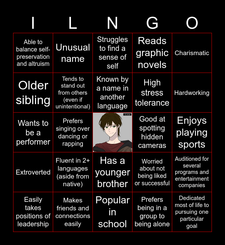 This bingo card has a free space and 24 words: Fluent in 2+ languages (aside from native), Makes friends and connections easily, Known by a name in another language, Easily takes positions of leadership, Charismatic, Able to balance self-preservation and altruism, Older sibling, Unusual name, Good at spotting hidden cameras, Has a younger brother, High stress tolerance, Wants to be a performer, Worried about not being liked or successful, Auditioned for several programs and entertainment companies, Tends to stand out from others (even if unintentional), Prefers being in a group to being alone, Enjoys playing sports, Struggles to find a sense of self, Hardworking, Prefers singing over dancing or rapping, Dedicated most of life to pursuing one particular goal, Extroverted, Reads graphic novels and Popular in school.