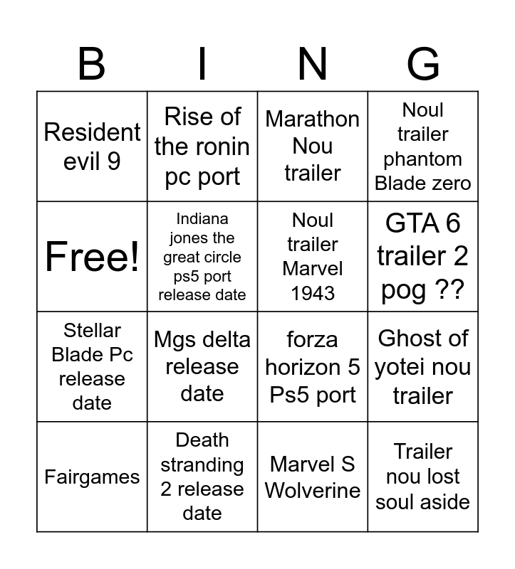 This bingo card has 16 words: Death stranding 2 release date, Ghost of yotei nou trailer, Marathon Nou trailer, Resident evil 9, Stellar Blade Pc release date, Rise of the ronin pc port, forza horizon 5 Ps5 port, Marvel S Wolverine, Free!, Indiana jones the great circle ps5 port release date, Fairgames, Noul trailer phantom Blade zero, Mgs delta release date, GTA 6 trailer 2 pog ??, Noul trailer Marvel 1943 and Trailer nou lost soul aside.