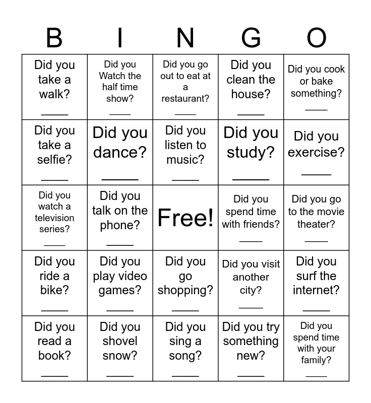 This bingo card has a free space and 24 words: Did you play video games? ____, Did you shovel snow? ____, Did you listen to music? ____, Did you read a book? ____, Did you cook or bake something? ____, Did you take a walk? ____, Did you take a selfie? ____, Did you Watch the half time show? ____, Did you spend time with friends? ____, Did you go shopping? ____, Did you study? ____, Did you watch a television series? ____, Did you visit another city? ____, Did you surf the internet? ____, Did you dance? ____, Did you try something new? ____, Did you go to the movie theater? ____, Did you go out to eat at a restaurant? ____, Did you exercise? ____, Did you talk on the phone? ____, Did you spend time with your family? ____, Did you ride a bike? ____, Did you clean the house? ____ and Did you sing a song? ____.
