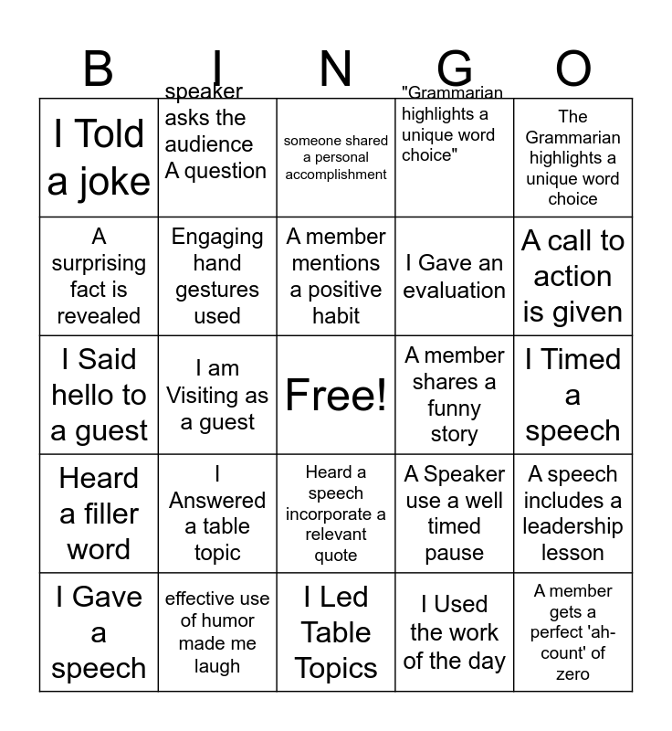 This bingo card has a free space and 29 words: I Gave a speech, evaluation include a specific compliment, I am Visiting as a guest, I Chose the word of the day, I Told a joke, someone shared a personal accomplishment, Engaging hand gestures used, I Answered a table topic, A member shares a funny story, effective use of humor made me laugh, I Timed a speech, A member gets a perfect 'ah-count' of zero, I Led Table Topics, I Used the work of the day, A call to action is given, I Answered a quiz master ?, Heard a speech incorporate a relevant quote, Heard a filler word, The Grammarian highlights a unique word choice, I Said hello to a guest, A Speaker use a well timed pause, Heard a guest introduce themselves, I Gave an evaluation, A surprising fact is revealed, "Grammarian highlights a unique word choice", speaker asks the audience A question, A speech includes a leadership lesson, A member mentions a positive habit and speaker uses a funny anecdote,.