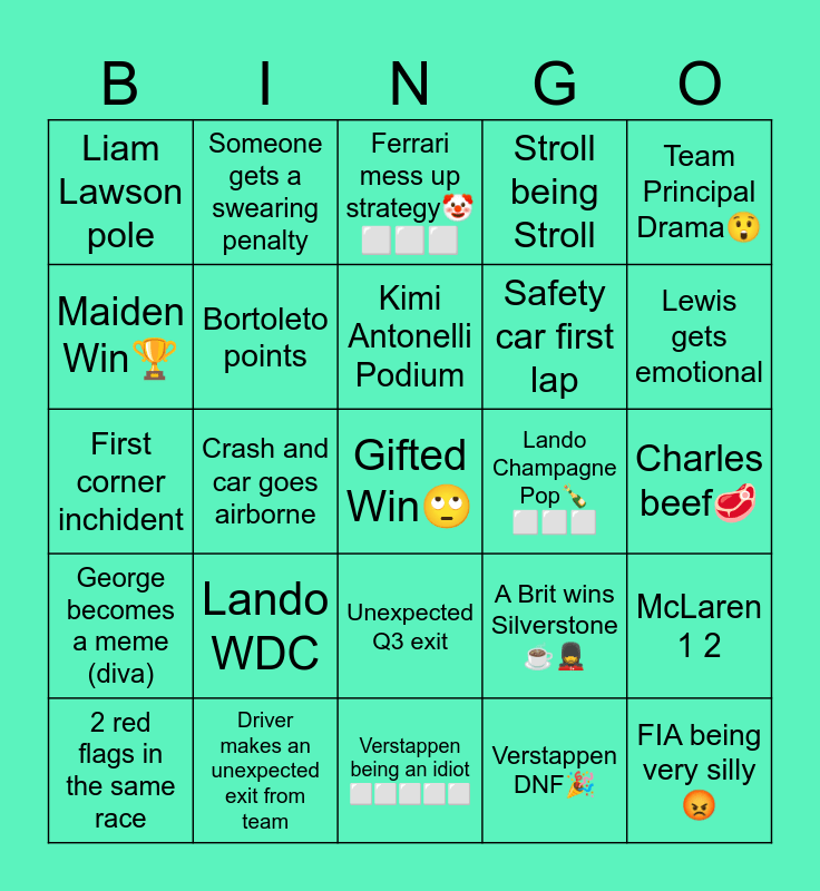 This bingo card has 25 words: George becomes a meme (diva), Driver makes an unexpected exit from team, Gifted Win🙄, Verstappen DNF🎉, Team Principal Drama😲, Liam Lawson pole, Someone gets a swearing penalty, Ferrari mess up strategy🤡 ⬜⬜⬜, Lando Champagne Pop🍾 ⬜⬜⬜, McLaren 1 2, Maiden Win🏆, Bortoleto points, Verstappen being an idiot ⬜⬜⬜⬜⬜, A Brit wins Silverstone☕💂♀️, Lewis gets emotional, 2 red flags in the same race, Crash and car goes airborne, Kimi Antonelli Podium, Safety car first lap, Charles beef🥩, First corner inchident, Lando WDC, Unexpected Q3 exit, Stroll being Stroll and FIA being very silly😡.