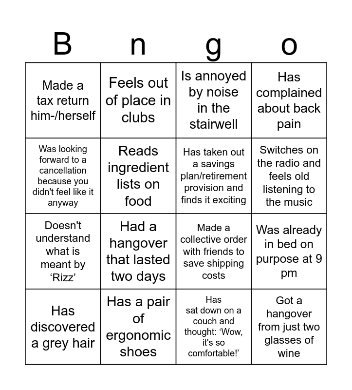 This bingo card has 16 words: Has a pair of ergonomic shoes, Was already in bed on purpose at 9 pm, Is annoyed by noise in the stairwell, Made a tax return him-/herself, Doesn't understand what is meant by ‘Rizz’, Feels out of place in clubs, Made a collective order with friends to save shipping costs, Has sat down on a couch and thought: ‘Wow, it's so comfortable!’, Was looking forward to a cancellation because you didn't feel like it anyway, Reads ingredient lists on food, Has discovered a grey hair, Has complained about back pain, Had a hangover that lasted two days, Switches on the radio and feels old listening to the music, Has taken out a savings plan/retirement provision and finds it exciting and Got a hangover from just two glasses of wine.