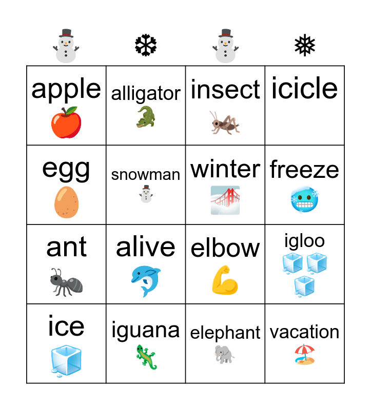 This bingo card has 16 words: iguana🦎, igloo 🧊🧊🧊, insect🦗, apple🍎, ant 🐜, alligator🐊, elbow💪, elephant🐘, egg 🥚, snowman⛄️, ice 🧊, icicle, alive 🐬, freeze🥶, winter🌁 and vacation🏖️.