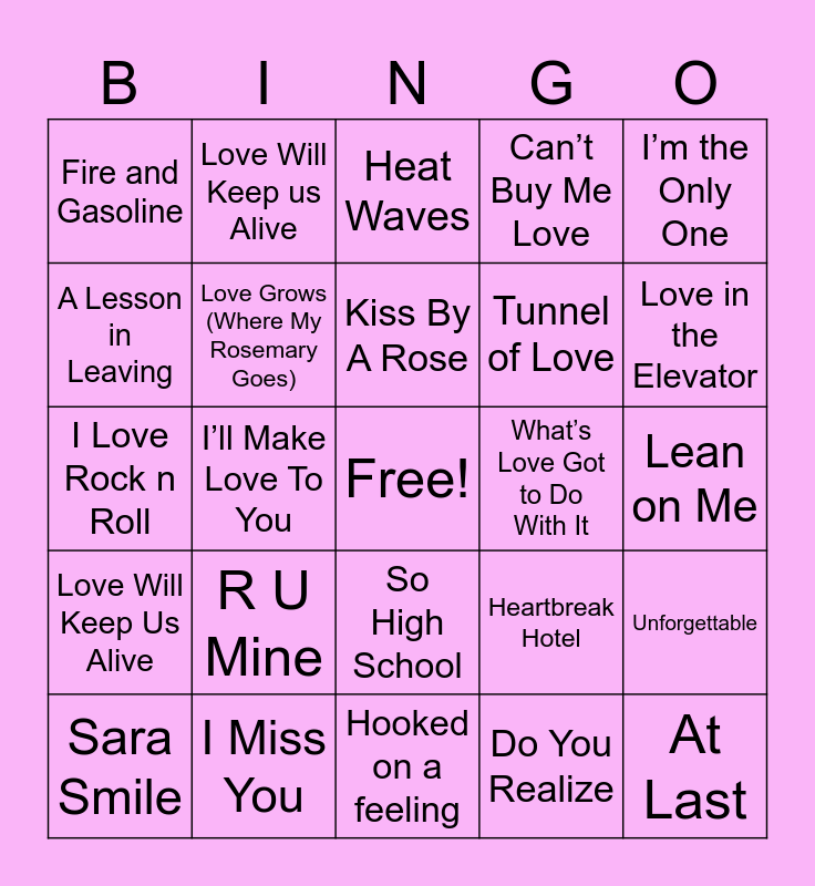 This bingo card has a free space and 113 words: Jolene, Baby, I Wanna Dance with Somebody, Hey There Delilah, Neon Moon, You Belong With Me, Can’t Buy Me Love, Such Great Heights, Banana Pancakes, Better Together, Check Yes or No, Meet in the Middle, Love Story, I Will Always Love You, You Save Me, This Kiss, So High School, The Alchemy, Lover, Baby I’m Yours, Sara Smile, Heat Waves, Love Song, Carrying Your Love With Me, Slide, Love Will Keep Us Alive, I Miss You, Iris, Afternoon Delight, I Want It That Way, Love in the Elevator, Kiss By A Rose, I’ll Make Love To You, It Wasn’t Me, All My Life, Let’s Get it On, Can’t Fight This Feeling, Open Arms, Saving All My Love, Jessie’s Girl, Easy, Espresso, Before He Cheat, Look What You Made Me Do, Home, Goodbye Earl, Do You Realize, A Lesson in Leaving, Toxic, Beautiful Trauma, Can’t Help Falling in Love, What’s Love Got to Do With It, What is Love?, Endless Love, Paradise by the Dashboard Light, Unchained Melody, Heartbreak Hotel, I Can’t Help Falling in Love with You, May I Have This Dance, L.O.V.E, Unforgettable, One Less Lonely Girl, Mistletoe, Stand By Me, Never Gonna Give You Up, Amazing Grace, Just As I Am, Love Grows (Where My Rosemary Goes), I Love Rock n Roll, Lovely Day, Lean on Me, Your Song, All of Me, All You Need is Love, Some Enchanted Evening, At Last, R U Mine, Fire and Gasoline, Your Cheatin Heart, Achey Breaky Heart, Stairway to Heaven, Love Will Keep us Alive, Unchained Melody, Heartbreak Hotel, Tunnel of Love, Won’t You Tell Me Your Name, May I Have This Dance, All Out of Love, I LovedYou First, Just Haven’t MEt You Yet, Go youre own way, I’ve Had The Time Of My Life, I’m the Only One, Freebird, You’re My First, My Last, My Everything, Conversations In the Dark, No else on on earth, Kiss me thru the phone, Lets stay together, Home, Wish you were here, Beautiful things, We belong together, Amber, Enchanted, Rescue me, Hooked on a feeling, Lovebug, Nothing compares 2 u, Careless Whisper, You give love a bad name, With or Without You and My heart will go on.