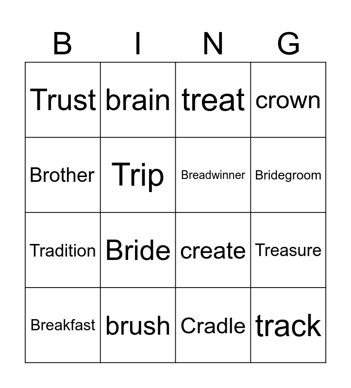 This bingo card has 16 words: brush, Treasure, treat, Trust, Tradition, brain, create, Cradle, Brother, Trip, Breakfast, crown, Bride, Bridegroom, Breadwinner and track.