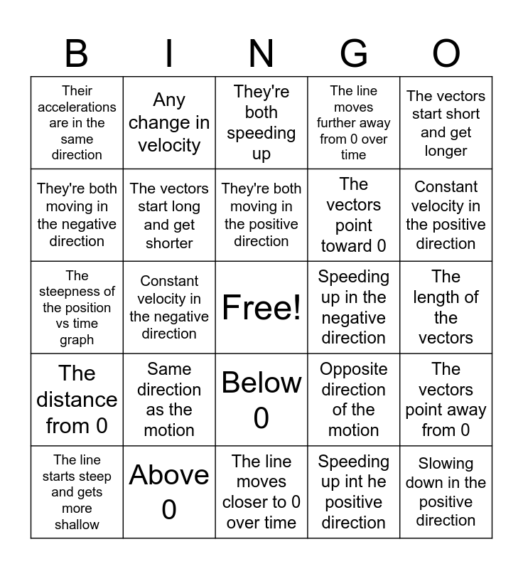 This bingo card has a free space and 29 words: The line starts steep and gets more shallow, The line starts shallow and gets more steep, Constant velocity in the negative direction, Slowing down in the negative direction, Their accelerations are in the same direction, They're both speeding up, The vectors start long and get shorter, Same direction as the motion, Speeding up in the negative direction, Above 0, The length of the vectors, Slowing down in the positive direction, The line moves closer to 0 over time, Speeding up int he positive direction, Constant velocity in the positive direction, They're both slowing down, Below 0, The distance from 0, The vectors start short and get longer, The steepness of the position vs time graph, Opposite direction of the motion, Constant velocity, The vectors point toward 0, They're both moving in the negative direction, The line moves further away from 0 over time, Any change in velocity, The vectors point away from 0, They're both moving in the positive direction and Their accelerations are in opposite directions.