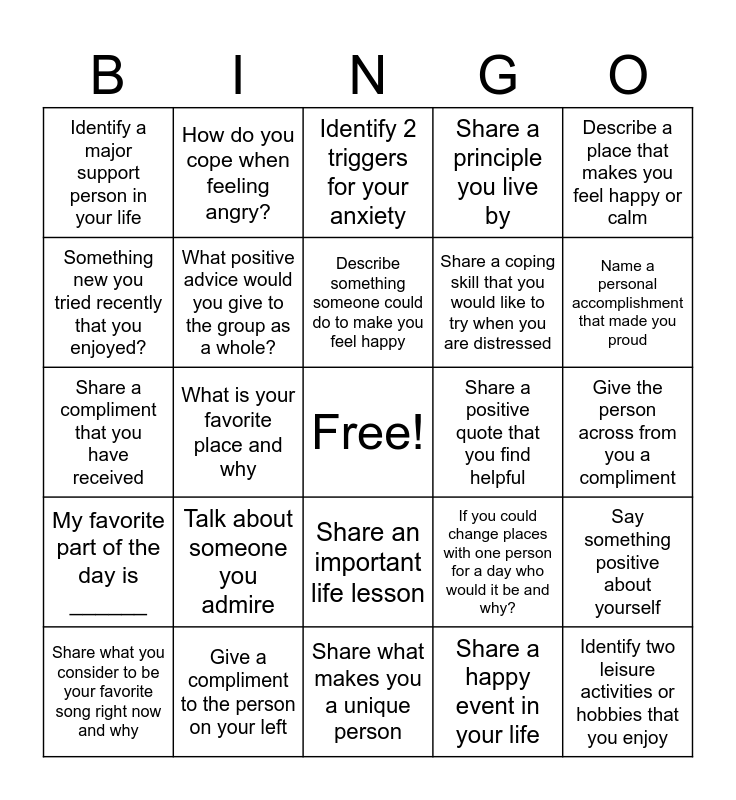 This bingo card has a free space and 29 words: Say something positive about someone else, Give a compliment to the person on your left, Identify 2 triggers for your anxiety, Share a smell that makes you feel happy, Describe a place that makes you feel happy or calm, Identify a major support person in your life, What positive advice would you give to the group as a whole?, Describe something someone could do to make you feel happy, Share a positive quote that you find helpful, Say something positive about yourself, Share what you consider to be your favorite song right now and why, What is your favorite place and why, Share a happy event in your life, Identify two leisure activities or hobbies that you enjoy, Share a compliment that you have received, What is your favorite childhood memory?, Share what makes you a unique person, If you could change places with one person for a day who would it be and why?, Name a personal accomplishment that made you proud, My favorite part of the day is ______, Talk about someone you admire, Share 3 things you are grateful for, Share a coping skill that you would like to try when you are distressed, Give the person across from you a compliment, Something new you tried recently that you enjoyed?, How do you cope when feeling angry?, Share an important life lesson, Share a principle you live by and Advice you would give your younger self.