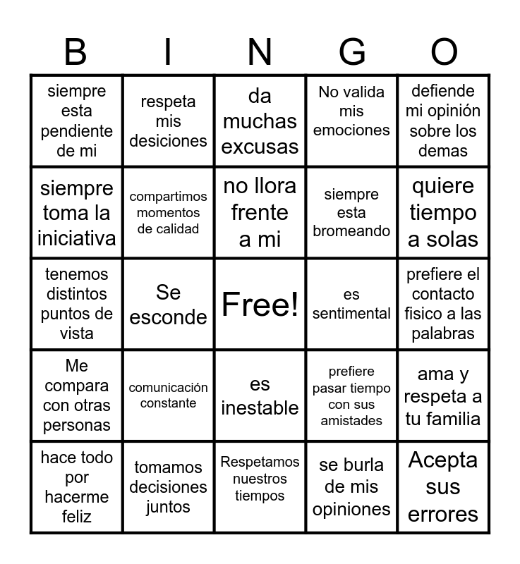 This bingo card has a free space and 24 words: comunicación constante, tomamos decisiones juntos, no llora frente a mi, hace todo por hacerme feliz, defiende mi opinión sobre los demas, siempre esta pendiente de mi, siempre toma la iniciativa, respeta mis desiciones, es sentimental, es inestable, siempre esta bromeando, tenemos distintos puntos de vista, prefiere pasar tiempo con sus amistades, ama y respeta a tu familia, compartimos momentos de calidad, se burla de mis opiniones, prefiere el contacto fisico a las palabras, da muchas excusas, quiere tiempo a solas, Se esconde, Acepta sus errores, Me compara con otras personas, No valida mis emociones and Respetamos nuestros tiempos.