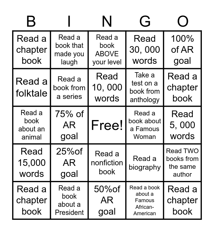This bingo card has a free space and 24 words: 25%of AR goal, Read a book about a President, Read 10, 000 words, Read a chapter book, 100% of AR goal, Read a chapter book, Read a folktale, Read a book that made you laugh, Read a book about a Famous Woman, Read a nonfiction book, Take a test on a book from anthology, Read a book about an animal, Read a biography, Read TWO books from the same author, Read a book from a series, Read a book about a Famous African-American, Read 5, 000 words, Read a book ABOVE your level, Read a chapter book, 75% of AR goal, Read a chapter book, Read 15,000 words, Read 30, 000 words and 50%of AR goal.