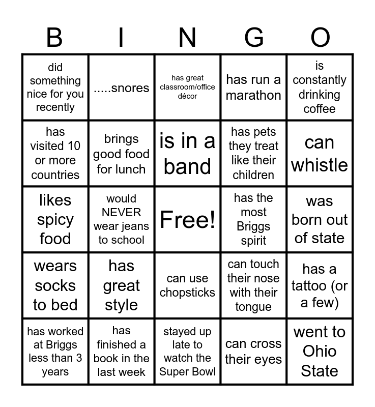 This bingo card has a free space and 29 words: has worked at Briggs less than 3 years, shares your birth month, would NEVER wear jeans to school, always has a snack when you need it, did something nice for you recently, has great classroom/office décor, brings good food for lunch, has great style, has the most Briggs spirit, has finished a book in the last week, was born out of state, went to Ohio State, stayed up late to watch the Super Bowl, can cross their eyes, can whistle, is always early, can use chopsticks, wears socks to bed, is constantly drinking coffee, likes spicy food, can touch their nose with their tongue, is left handed, has pets they treat like their children, has visited 10 or more countries, has run a marathon, .....snores, has a tattoo (or a few), is in a band and has worked at Briggs for 10 years or more.
