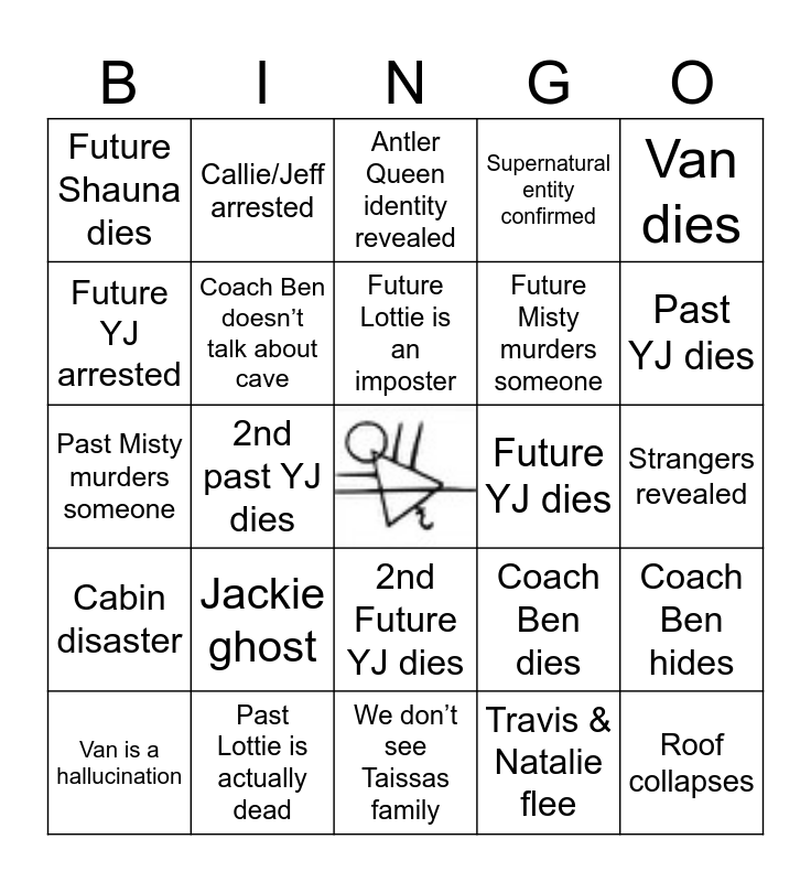 This bingo card has a free space and 24 words: Jackie ghost, Past Lottie is actually dead, Future Lottie is an imposter, Van is a hallucination, Van dies, Future Shauna dies, Future YJ arrested, Callie/Jeff arrested, Future YJ dies, 2nd Future YJ dies, Future Misty murders someone, Past Misty murders someone, Coach Ben dies, Coach Ben hides, Coach Ben doesn’t talk about cave, Travis & Natalie flee, Strangers revealed, Antler Queen identity revealed, Past YJ dies, 2nd past YJ dies, Roof collapses, Cabin disaster, Supernatural entity confirmed and We don’t see Taissas family.