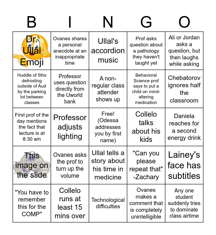 This bingo card has 2 images, a free space and 24 words: Ovanes asks the prof to turn up the volume, Collelo runs at least 15 mins over, A non-regular class attender shows up, "You have to remember this for the COMP", Ali or Jordan asks a question, but then laughs while asking, Dr. Ullal Emoji, Huddle of 5ths defrosting outside of Aud by the parking lot between classes, Ovanes shares a personal anecdote at an inappropriate time, Collelo talks about his kids, Ullal tells a story about his time in medicine, Behavioral Science prof says to put a child on mind-altering medication, First prof of the day mentions the fact that lecture is at 8:30 am, "Can you please repeat that" -Zachary, Lainey's face has subtitles, Professor uses question directly from the Uworld bank, Ovanes makes a comment that is completely unintelligible, Daniela reaches for a second energy drink, Ullal's accordion music, Chebatorov ignores half the classroom, Professor adjusts lighting, Any one student suddenly tries to dominate class airtime, This image on the slide, Prof asks question about a pathology they haven't taught yet and Technological difficulties.