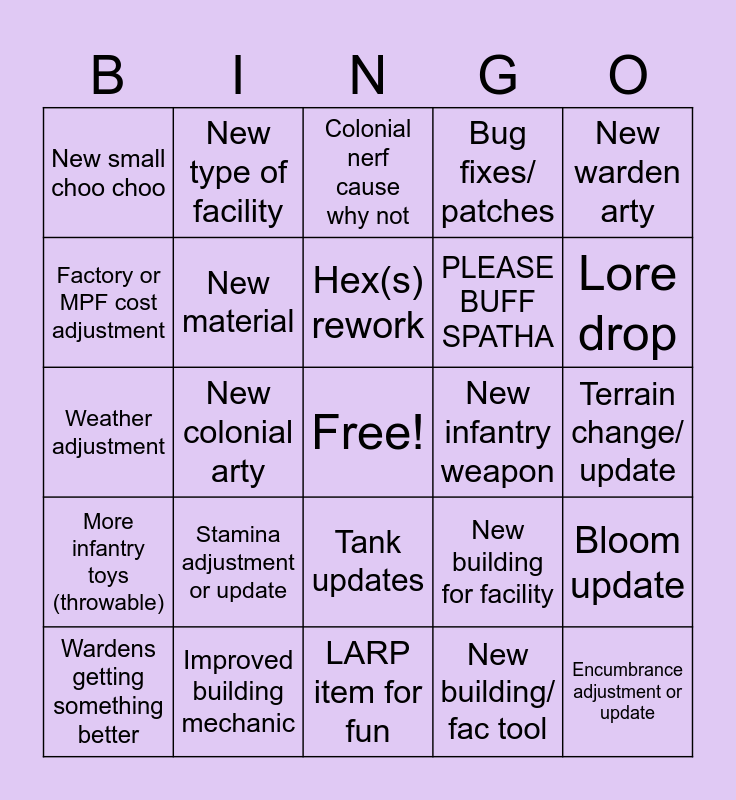 This bingo card has a free space and 24 words: Wardens getting something better, Stamina adjustment or update, Hex(s) rework, New building/ fac tool, New warden arty, New small choo choo, New type of facility, Colonial nerf cause why not, New infantry weapon, Terrain change/ update, Weather adjustment, New material, New building for facility, Bloom update, Factory or MPF cost adjustment, Improved building mechanic, LARP item for fun, Bug fixes/ patches, Lore drop, More infantry toys (throwable), New colonial arty, Tank updates, PLEASE BUFF SPATHA and Encumbrance adjustment or update.