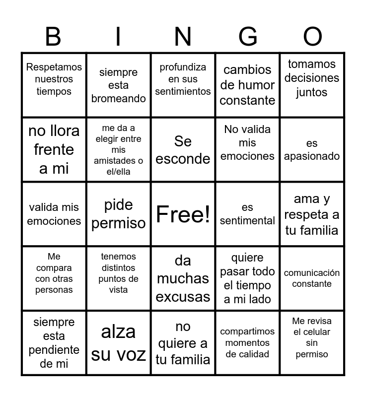 This bingo card has a free space and 24 words: tenemos distintos puntos de vista, alza su voz, Se esconde, siempre esta pendiente de mi, tomamos decisiones juntos, Respetamos nuestros tiempos, no llora frente a mi, siempre esta bromeando, es sentimental, da muchas excusas, No valida mis emociones, valida mis emociones, quiere pasar todo el tiempo a mi lado, comunicación constante, me da a elegir entre mis amistades o el/ella, compartimos momentos de calidad, ama y respeta a tu familia, profundiza en sus sentimientos, es apasionado, pide permiso, Me revisa el celular sin permiso, Me compara con otras personas, cambios de humor constante and no quiere a tu familia.