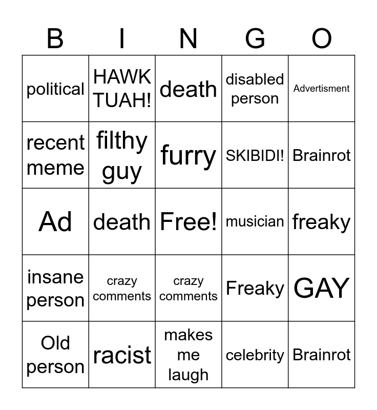 This bingo card has a free space and 49 words: the n-word, Brainrot, Old person, makes me laugh, crazy comments, insane person, HAWK TUAH!, dead meme, recent meme, racist, filthy guy, disabled person, GAY, Freaky, ADHD, creep, furry, musician, company, Advertisment, death, celebrity, political, SKIBIDI!, n-word, Brainrot, Old person, makes me laugh, crazy comments, insane person, disabled person, HAWK TUAH, dead meme, recent meme, racist, filthy guy, FREE!, GAY, freaky, ADHD, creep, Furry, musician, company, Ad, death, celebrity, political and skibidi!.