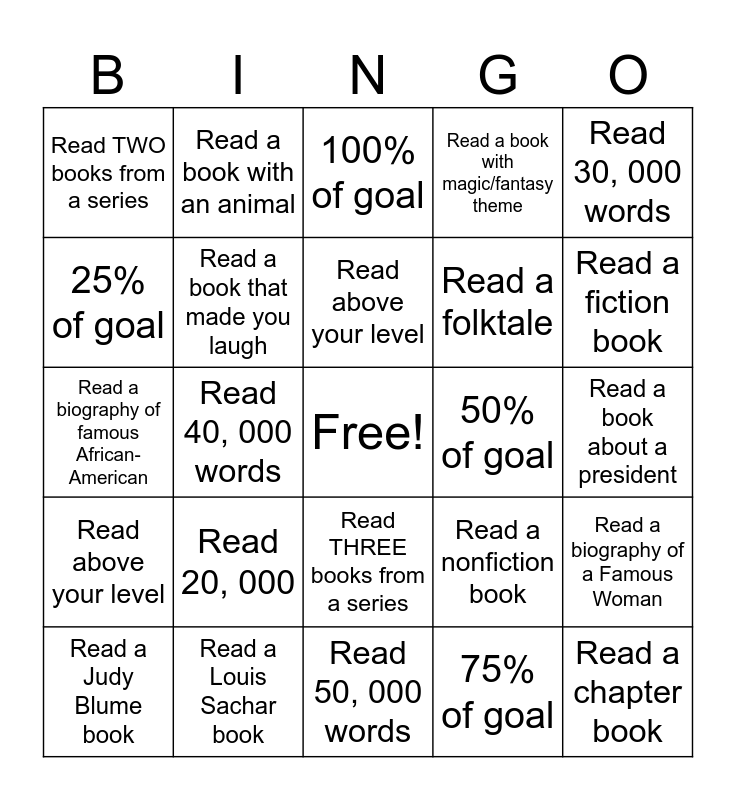 This bingo card has a free space and 24 words: Read 20, 000, Read a Louis Sachar book, Read above your level, Read a Judy Blume book, Read 30, 000 words, Read TWO books from a series, 25% of goal, Read a book with an animal, 50% of goal, Read THREE books from a series, Read a folktale, Read a biography of famous African-American, Read a nonfiction book, Read a biography of a Famous Woman, Read a book that made you laugh, 75% of goal, Read a book about a president, 100% of goal, Read a fiction book, Read 40, 000 words, Read a chapter book, Read above your level, Read a book with magic/fantasy theme and Read 50, 000 words.