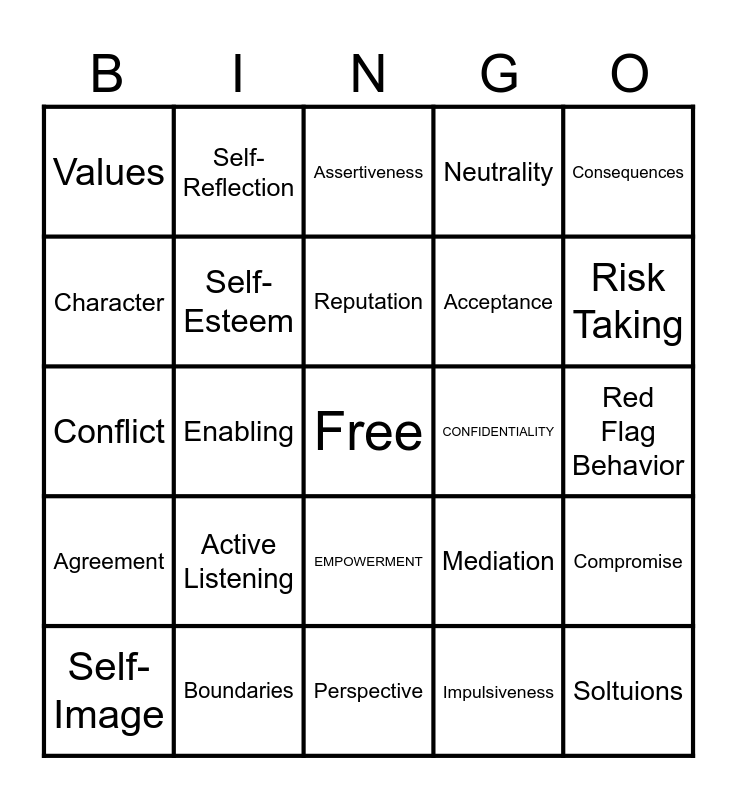This bingo card has a free space and 24 words: Active Listening, Boundaries, Reputation, Self- Image, Consequences, Values, Character, Self-Reflection, CONFIDENTIALITY, EMPOWERMENT, Acceptance, Conflict, Mediation, Compromise, Self- Esteem, Impulsiveness, Red Flag Behavior, Assertiveness, Risk Taking, Enabling, Soltuions, Agreement, Neutrality and Perspective.