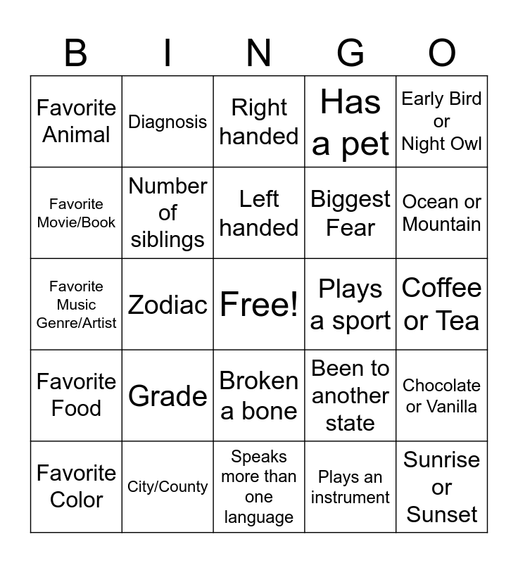 This bingo card has a free space and 24 words: Favorite Color, Grade, Left handed, Plays an instrument, Early Bird or Night Owl, Favorite Animal, Diagnosis, Right handed, Plays a sport, Coffee or Tea, Favorite Music Genre/Artist, Number of siblings, Been to another state, Chocolate or Vanilla, Favorite Movie/Book, City/County, Speaks more than one language, Has a pet, Ocean or Mountain, Favorite Food, Zodiac, Broken a bone, Biggest Fear and Sunrise or Sunset.