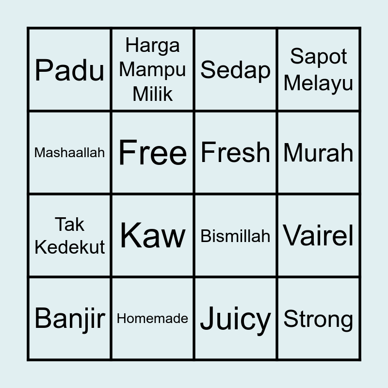 This bingo card has 16 words: Homemade, Vairel, Sedap, Padu, Tak Kedekut, Harga Mampu Milik, Bismillah, Juicy, Mashaallah, Free, Banjir, Sapot Melayu, Kaw, Murah, Fresh and Strong.