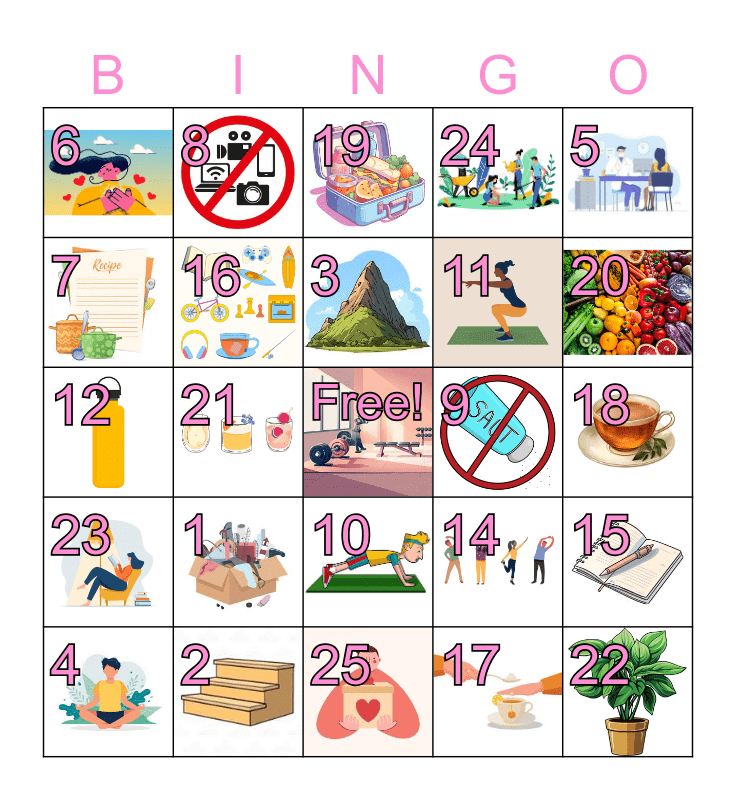This bingo card has 24 images, a free space and 24 words: 1, 2, 3, 4, 5, 6, 7, 8, 9, 10, 11, 12, 14, 15, 16, 17, 18, 19, 20, 21, 22, 23, 24 and 25.