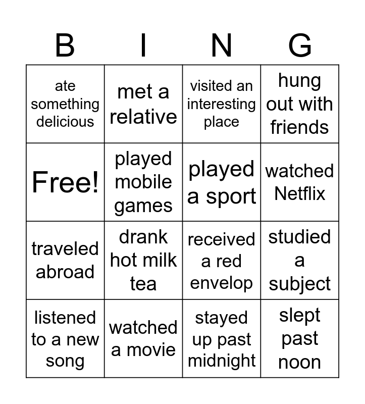 This bingo card has 16 words: watched a movie, studied a subject, visited an interesting place, ate something delicious, traveled abroad, met a relative, received a red envelop, stayed up past midnight, Free!, played mobile games, listened to a new song, hung out with friends, drank hot milk tea, watched Netflix, played a sport and slept past noon.