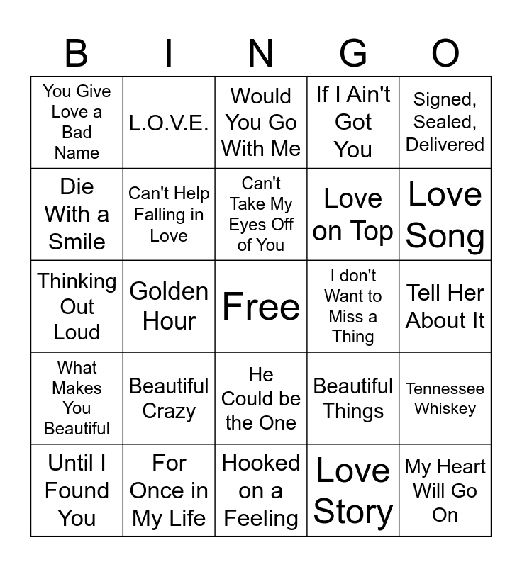 This bingo card has a free space and 34 words: My Girl, Love Story, Kiss Me, Just the Way You Are, What Makes You Beautiful, Can't Help Falling in Love, Signed, Sealed, Delivered, Until I Found You, L.O.V.E., I Will Always Love You, Can't Take My Eyes Off of You, Would You Go With Me, At Last, Young & Beautiful, I don't Want to Miss a Thing, Love Song, For Once in My Life, Thinking Out Loud, Beautiful Crazy, Beautiful Things, He Could be the One, Ain't No Mountain High Enough, You Give Love a Bad Name, Tell Her About It, Hooked on a Feeling, My Heart Will Go On, If I Ain't Got You, Just the Two of Us, Love on Top, Die With a Smile, Rewrite the Stars, Golden Hour, Tennessee Whiskey and Love on the Brain.