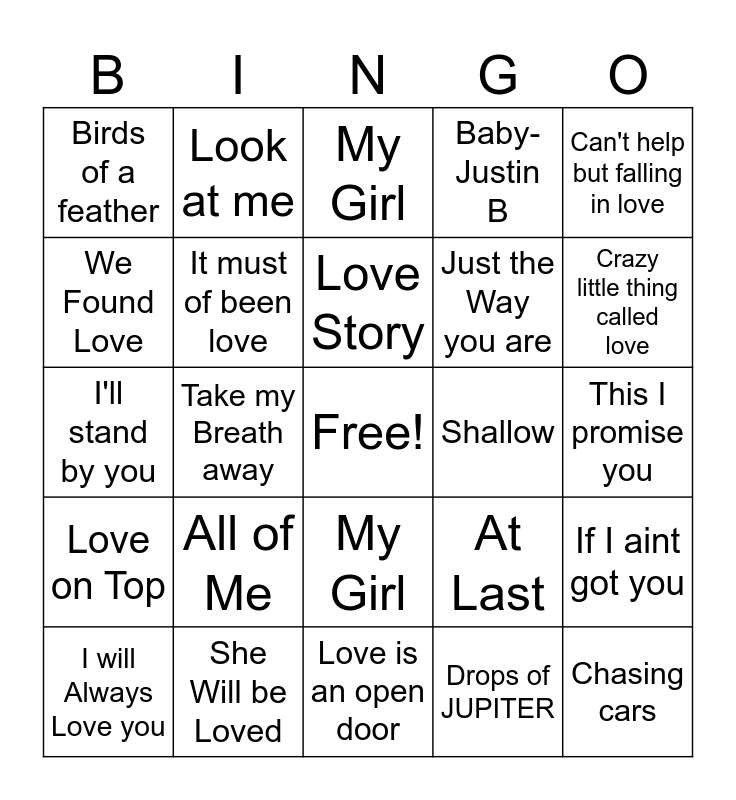 This bingo card has a free space and 24 words: All of Me, She Will be Loved, Love Story, I will Always Love you, Can't help but falling in love, Birds of a feather, We Found Love, Look at me, Shallow, My Girl, Just the Way you are, I'll stand by you, At Last, If I aint got you, It must of been love, Drops of JUPITER, This I promise you, My Girl, Crazy little thing called love, Take my Breath away, Chasing cars, Love on Top, Baby-Justin B and Love is an open door.