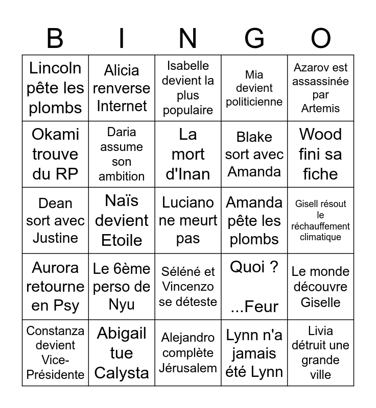 This bingo card has a free space and 24 words: Le 6ème perso de Nyu, Abigail tue Calysta, La mort d'Inan, Constanza devient Vice-Présidente, Azarov est assassinée par Artemis, Lincoln pête les plombs, Okami trouve du RP, Alicia renverse Internet, Amanda pête les plombs, Séléné et Vincenzo se déteste, Blake sort avec Amanda, Dean sort avec Justine, Quoi ? ...Feur, Le monde découvre Giselle, Daria assume son ambition, Lynn n'a jamais été Lynn, Gisell résout le réchauffement climatique, Isabelle devient la plus populaire, Wood fini sa fiche, Naïs devient Etoile, Livia détruit une grande ville, Aurora retourne en Psy, Mia devient politicienne and Alejandro complète Jérusalem.