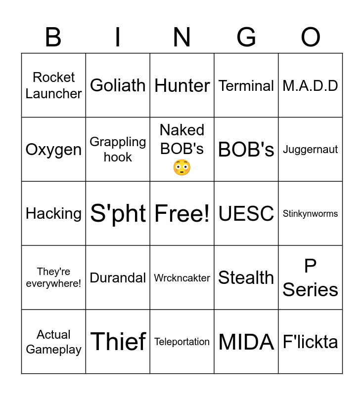 This bingo card has a free space and 29 words: Actual Gameplay, Frogblast Ventcore, S'pht, Pfhor, Rocket Launcher, Hunter, Grappling hook, Durandal, UESC, Thief, Stinkynworms, F'lickta, Teleportation, MIDA, Juggernaut, Rampamcy, Wrckncakter, They're everywhere!, M.A.D.D, Hacking, Stealth, Sekiguchi, BOB's, Oxygen, Terminal, Goliath, P Series, Naked BOB's 😳 and Armor.