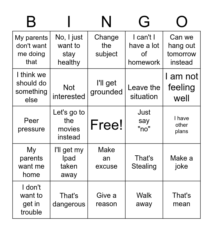 This bingo card has a free space and 24 words: I'll get my Ipad taken away, That's dangerous, I'll get grounded, I don't want to get in trouble, Can we hang out tomorrow instead, My parents don't want me doing that, I think we should do something else, No, I just want to stay healthy, Just say "no", Make an excuse, Leave the situation, Peer pressure, That's Stealing, Make a joke, Not interested, Walk away, I have other plans, Change the subject, I am not feeling well, Let's go to the movies instead, That's mean, My parents want me home, I can't I have a lot of homework and Give a reason.