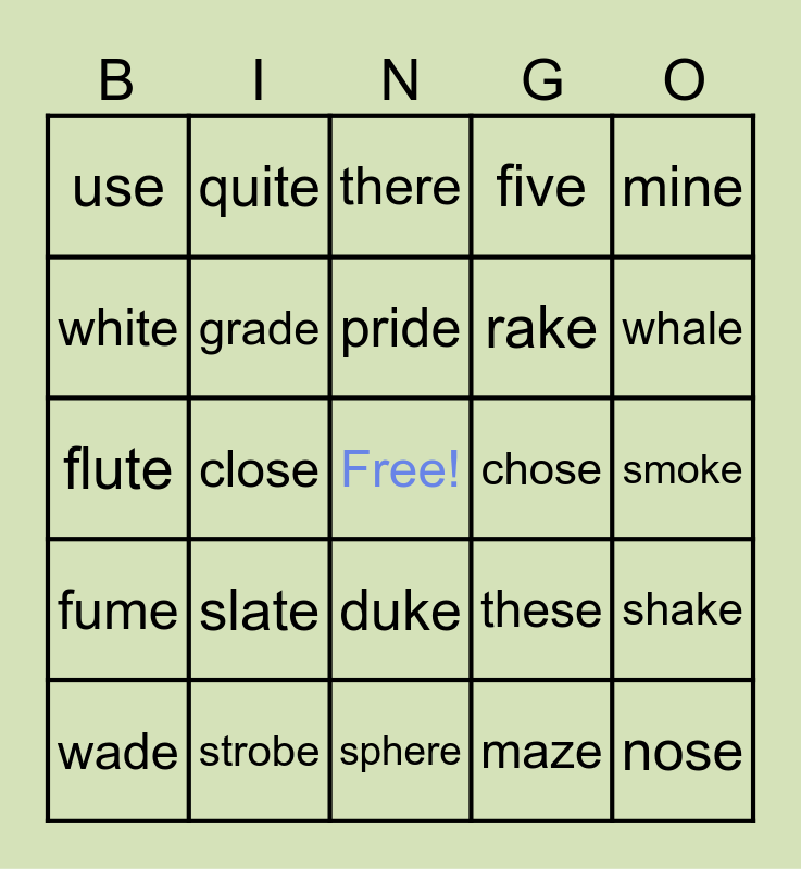 This bingo card has a free space and 34 words: phone, maze, crime, here, fume, grade, mine, wade, quite, froze, pride, there, blame, smile, chose, whale, strobe, flute, slate, these, duke, stone, use, smoke, sphere, nose, five, came, rake, white, blade, close, shake and mute.