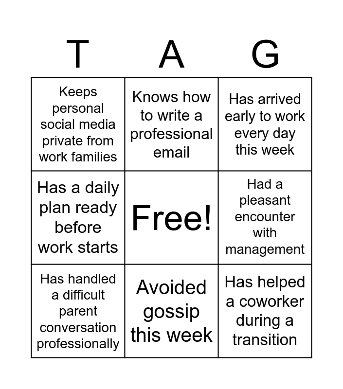 This bingo card has a free space and 8 words: Had a pleasant encounter with management, Has arrived early to work every day this week, Knows how to write a professional email, Has handled a difficult parent conversation professionally, Keeps personal social media private from work families, Has helped a coworker during a transition, Has a daily plan ready before work starts and Avoided gossip this week.