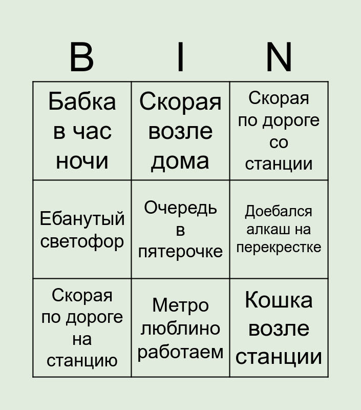 This bingo card has 9 words: Скорая по дороге на станцию, Скорая по дороге со станции, Скорая возле дома, Ебанутый светофор, Бабка в час ночи, Доебался алкаш на перекрестке, Очередь в пятерочке, Кошка возле станции and Метро люблино работаем.