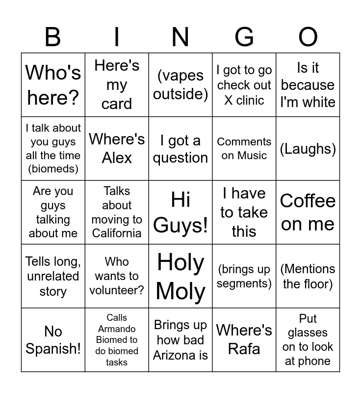 This bingo card has a free space and 24 words: No Spanish!, Who wants to volunteer?, I got a question, Where's Rafa, Is it because I'm white, Who's here?, Here's my card, (vapes outside), I have to take this, Coffee on me, Are you guys talking about me, Where's Alex, (brings up segments), (Mentions the floor), I talk about you guys all the time (biomeds), Calls Armando Biomed to do biomed tasks, Brings up how bad Arizona is, I got to go check out X clinic, (Laughs), Tells long, unrelated story, Talks about moving to California, Holy Moly, Comments on Music and Put glasses on to look at phone.