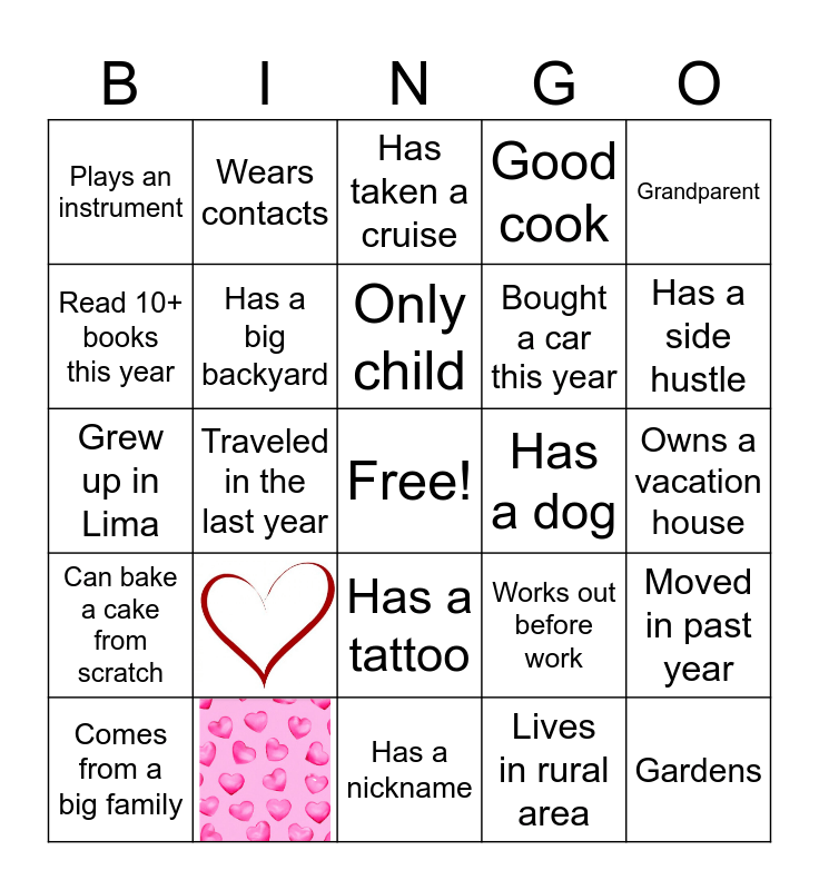 This bingo card has 2 images, a free space and 22 words: Only child, Comes from a big family, Grandparent, Plays an instrument, Read 10+ books this year, Wears contacts, Has a dog, Has a tattoo, Bought a car this year, Grew up in Lima, Works out before work, Moved in past year, Has a big backyard, Lives in rural area, Owns a vacation house, Has taken a cruise, Has a side hustle, Traveled in the last year, Gardens, Can bake a cake from scratch, Good cook and Has a nickname.