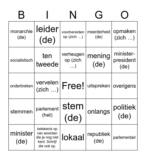This bingo card has a free space and 71 words: landelijk, leider (de), liberaal, links, lokaal, meegaan, meerderheid (de), melden bij (zich …), mening (de), minderheid (de), minister (de), ministerie (het), minister-president (de), monarchie (de), omkleden (zich…), onderbreken, onlangs, opmaken (zich …), oriënteren op (zich .., overigens, parlement (het), parlementair, politiek (de), premier (de), president (de), progressief, realiseren (zich .., Woordenlijst, Thema 6 Politiek Kies je links of rechts?, Ken je alle woorden uit dit thema? Geef een omschrijving of vertaling bij de bekende woorden. Zoek de, betekenis op van woorden die je nog niet kent. Schrijf die ook op., De sprong Woordenlijst thema 6 © Maud Beersmans, Wim Tersteeg en Boom, www.nt2.nl 2, rechts, religieus, republiek (de), samenleving (de), schamen voor (zich …), scheren (zich …), socialistisch, staatssecretaris (de), stem (de), stembureau (het), stemmen, stempas (de), stroming (de), ten eerste, ten slotte / tot slot, ten tweede, terugvragen, uitleggen, uitpraten, uitslag (de), uitspreken, verbazen over (zich .., verder, vergissen in (zich …), verheugen op (zich …), verkiezingen (de), vermaken (zich…), veroorloven (zich …), verslapen (zich …), vertegenwoordiger (de), vervelen (zich …), voelen (zich …), volgens, volmacht (de), voorbereiden op (zich …), voorstellen (zich .., voorstellen aan (zich …), wassen (zich …) and zorgen maken over.