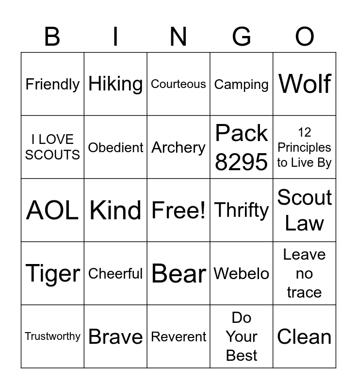 This bingo card has a free space and 29 words: Trustworthy, Helpful, Kind, Loyal, Friendly, Courteous, Obedient, Cheerful, Thrifty, Brave, Scout Law, Clean, Reverent, Do Your Best, 12 Principles to Live By, Lion, Bear, Tiger, Wolf, AOL, Webelo, Cub Scouts, Pack 8295, I LOVE SCOUTS, Camping, Hiking, Leave no trace, Archery and Swimming.