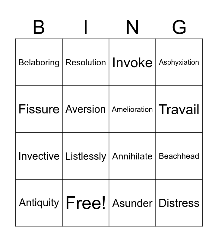 This bingo card has 16 words: Free!, Beachhead, Invoke, Belaboring, Invective, Resolution, Annihilate, Asunder, Fissure, Aversion, Antiquity, Asphyxiation, Listlessly, Travail, Amelioration and Distress.