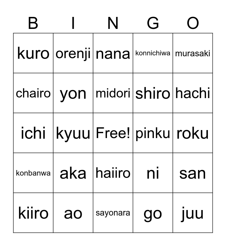 This bingo card has a free space and 24 words: aka, ao, midori, kiiro, murasaki, kuro, chairo, orenji, pinku, haiiro, shiro, ichi, ni, san, yon, go, roku, nana, hachi, kyuu, juu, konbanwa, konnichiwa and sayonara.