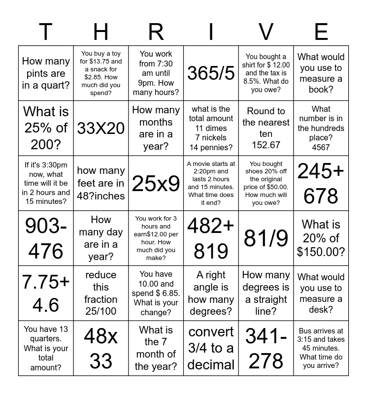 This bingo card has 36 words: A right angle is how many degrees?, You have 10.00 and spend $ 6.85. What is your change?, convert 3/4 to a decimal, What is 25% of 200?, 903-476, A movie starts at 2:20pm and lasts 2 hours and 15 minutes. What time does it end?, 33X20, What is the 7 month of the year?, You bought a shirt for $ 12.00 and the tax is 8.5%. What do you owe?, How many degrees is a straight line?, What number is in the hundreds place? 4567, 365/5, What would you use to measure a desk?, how many feet are in 48?inches, what is the total amount 11 dimes 7 nickels 14 pennies?, How many pints are in a quart?, 7.75+ 4.6, You bought shoes 20% off the original price of $50.00. How much will you owe?, If it's 3:30pm now, what time will it be in 2 hours and 15 minutes?, You work from 7:30 am until 9pm. How many hours?, 25x9, How many day are in a year?, 482+ 819, You work for 3 hours and earn$12.00 per hour. How much did you make?, 81/9, You buy a toy for $13.75 and a snack for $2.85. How much did you spend?, Round to the nearest ten 152.67, 48x 33, How many months are in a year?, What would you use to measure a book?, Bus arrives at 3:15 and takes 45 minutes. What time do you arrive?, You have 13 quarters. What is your total amount?, What is 20% of $150.00?, 245+ 678, reduce this fraction 25/100 and 341-278.