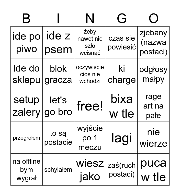 This bingo card has a free space and 24 words: to są postacie, schylałem, oczywiście cios nie wchodzi, na offline bym wygrał, zjebany (nazwa postaci), ide po piwo, ide do sklepu, ide z psem, bixa w tle, wyjście po 1 meczu, ki charge, setup zalery, lagi, nie wierze, blok gracza, zaś(ruch postaci), rage art na pałe, żeby nawet nie szło wcisnąć, odgłosy małpy, let's go bro, puca w tle, przegrołem, czas sie powiesić and wiesz jako.