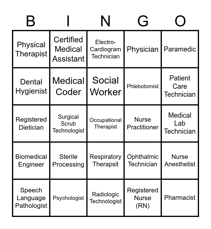 This bingo card has a free space and 24 words: Sterile Processing, Psychologist, Social Worker, Speech Language Pathologist, Paramedic, Physical Therapist, Dental Hygienist, Certified Medical Assistant, Nurse Practitioner, Respiratory Therapsit, Phlebotomist, Registered Dietician, Ophthalmic Technician, Nurse Anesthetist, Medical Coder, Registered Nurse (RN), Medical Lab Technician, Electro- Cardiogram Technician, Patient Care Technician, Surgical Scrub Technologist, Pharmacist, Biomedical Engineer, Physician and Radiologic Technologist.