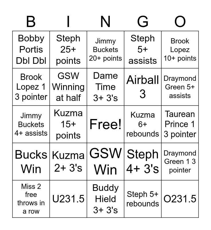 This bingo card has a free space and 26 words: GSW Win, Steph 5+ rebounds, Dame Time 3+ 3's, U231.5, Brook Lopez 10+ points, Bobby Portis Dbl Dbl, Brook Lopez 1 3 pointer, Steph 25+ points, Taurean Prince 1 3 pointer, Steph 4+ 3's, Airball 3, Jimmy Buckets 4+ assists, Draymond Green 1 3 pointer, Miss 2 free throws in a row, Kuzma 15+ points, Dame Time 25+ points, Steph 5+ assists, Bucks Win, Jimmy Buckets 20+ points, O231.5, Draymond Green 5+ assists, Buddy Hield 3+ 3's, Kuzma 6+ rebounds, Kuzma 2+ 3's, GSW Winning at half and Bucks Winning at half.