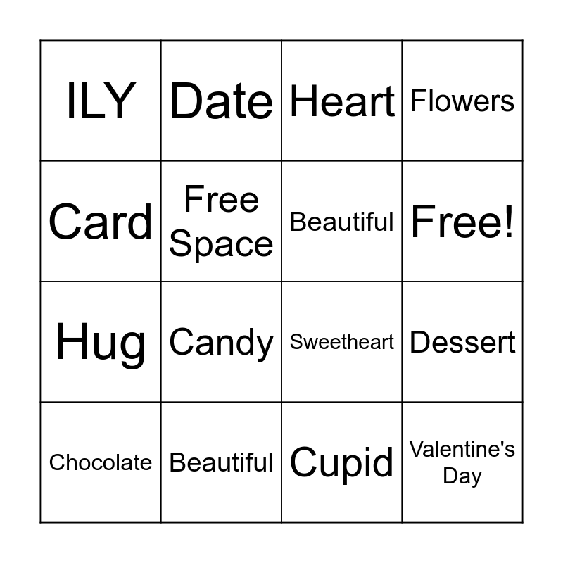 This bingo card has 18 words: Candy, Valentine's Day, Heart, ILY, Sweetheart, Flowers, Chocolate, Date, Free!, Hug, Cupid, Card, Dessert, Free Space, Beautiful, Feb. 14th, Beautiful and Give.